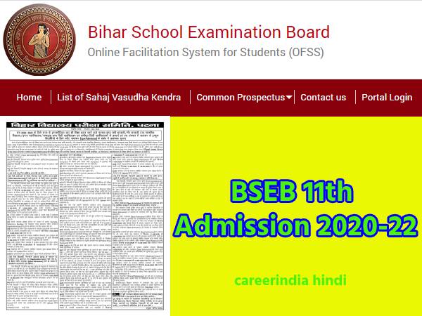 BSEB 11th Admissions 2020-22 Dates: बिहार स्कूल एग्जामिनेशन बोर्ड, पटना (BSEB) ने बीएसईबी कक्षा 11वीं में स्पॉट एडमिशन के लिए नोटिफिकेशन जारी कर दिया है। बिहार बोर्ड 11वीं एडमिशन 2020-22 की आवेदन प्रक्रिया 10 सितंबर से शुरू हो जाएगी। जो छात्र बिहार बोर्ड 11वीं एडमिशन 2020-22 के लिए आवेदन करना चाहते हैं, वह बिहार एडमिशन की आधिकारिक वेबसाइट ofss.bihar.in पर जाकर बिहार बोर्ड 11वीं एडमिशन 2020-22 के लिए आवेदन कर सकते हैं।