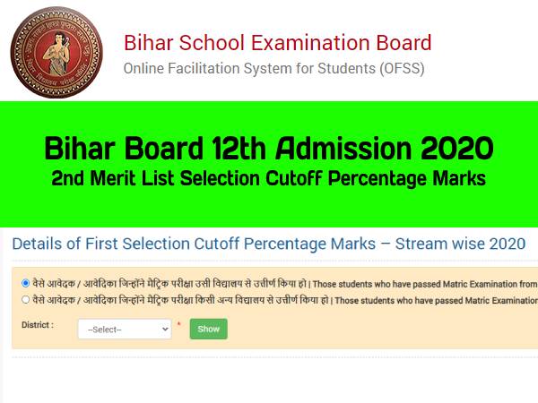 बोर्ड ने 7 अगस्त, 2020 को पहली मेरिट सूची जारी की। दूसरी मेरिट सूची में चयनित उम्मीदवारों का नामांकन 25 से 29 अगस्त, 2020 तक शुरू होगा। बिहार बोर्ड 29 अगस्त के बाद तीसरी मेरिट सूची जारी करेगा। छात्रों के लिए ऑनलाइन सुविधा प्रणाली (OFSS) छात्रों को बिहार के सभी 38 जिलों में बिहार स्कूल परीक्षा बोर्ड (BSEB) से संबद्ध और मान्यता प्राप्त विभिन्न कॉलेजों / स्कूलों में कला / विज्ञान / वाणिज्य / कृषि के इंटरमीडिएट पाठ्यक्रमों में प्रवेश लेने में सक्षम बनाता है।