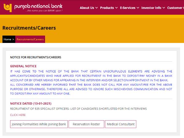 चरण 2: होमपेज पर 'रिक्रूटमेंट 'टैब पर क्लिक करें और पीएनबी एसओ रिजल्ट 2021 इंटरव्यू के लिंक पर क्लिक करें।