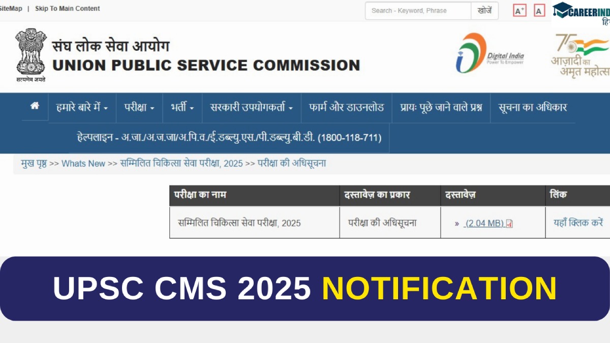 यूपीएससी सीएमएस भर्ती परीक्षा 2025 नोटिफिकेशन, पात्रता मानदंड, आयु सीमा, रिक्तियों की संख्या, आवेदन प्रक्रिया समेत अन्य जानकारी के लिए इस लेख को पूरा पढ़ें।
