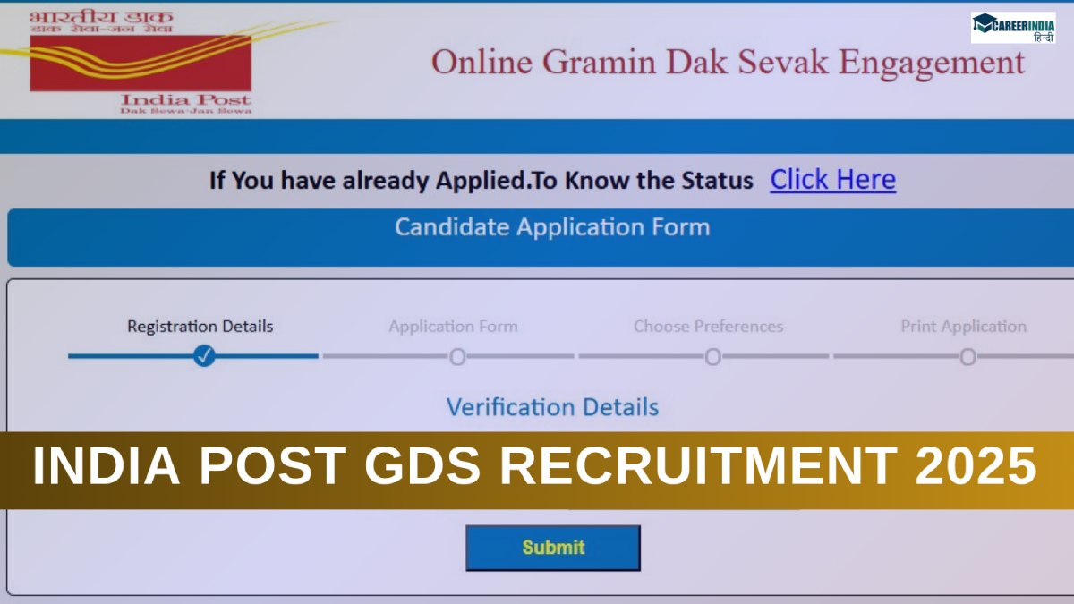 इंडिया पोस्ट जीडीएस पदों पर भर्ती के इच्छुक और योग्य उम्मीदवार इंडिया पोस्ट की आधिकारिक वेबसाइट indiapostgdsonline.gov.in के माध्यम से पंजीकरण कर सकते हैं। ग्रामीण डाक सेवक पदों पर भर्ती के लिए इच्छुक और पात्र उम्मीदवार ऑनलाइन आवेदन कर सकते हैं। इंडिया पोस्ट जीडीएस भर्ती 2025 के लिए आवेदन की प्रक्रिया बीते शुरू हो चुकी है। योग्य उम्मीदवार जो भर्ती अभियान के लिए आवेदन करना चाहते हैं वे आधिकारिक पोर्टल पर अपने आवेदन पत्र जमा कर सकते हैं।