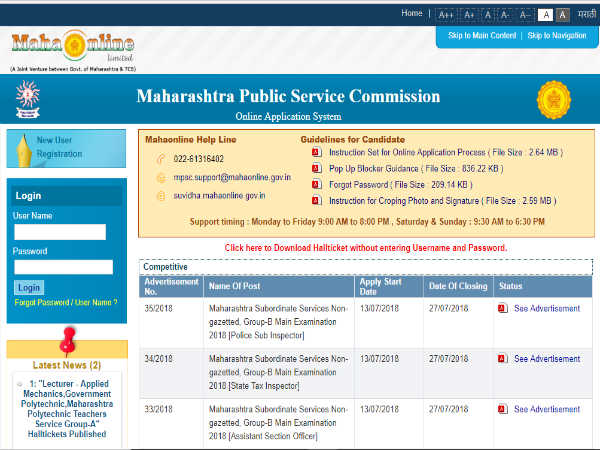 अगर आप इन पदों के लिए जरूरी योग्यता रखते है तो 27 जुलाई 2018 तक ऑनलाइन माध्यम से आवेदन कर सकते है। आवेदन करने के लिए आपको महाराष्ट्र पब्लिक सर्विस कमीशन की ऑफिसियल वेबसाइट https://www.mpsc.gov.in पर जाकर आवेदन करना होगा। आवेदन करने के लिए इन स्टेप्स को फॉलों करें-