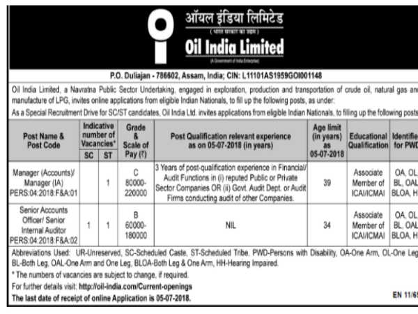 अगर आप किसी अच्छी सरकारी नौकरी का इंतजार कर रहे है तो आज हम आपके लिए एक अच्छी खबर लेकर आए है। दरअसल अभी हाल ही में ऑयल इंडिया लिमिटेड ने सीनियर अकाउंट्स ऑफिसर और मैनेजर के कई पदों पर भर्ती के लिए आवेदन आमंत्रित किए है। पदों की कुल संख्या 03 है। अगर आप इन पदों के लिए जरूरी योग्यता रखते है तो 5 जुलाई 2018 तक ऑनलाइन आवेदन कर सकते है। आवेदन करने से पहले इस वैकेंसी से जुड़ी ऑफिसियल जानकारी जरूर देख लें।
