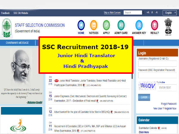 Staff Selection Commission Recruitment 2018: अगर आप किसी सरकारी नौकरी का इंतजार कर रहे है तो आज हम आपके लिए एक अच्छी खबर लेकर आए है। दरअसल अभी हाल ही में स्टाफ सेलेक्शन कमीशन (SSC) ने कई पदों पर भर्ती के लिए आवेदन आमंत्रित किए है। ये सभी पद जूनियर हिंदी ट्रांसलेटर (JHT) और हिंदी प्राध्यापक के है। इन पदों के लिए वे लोग आवेदन कर सकते है जिन्होनें किसी मान्यता प्राप्त संस्थान से हिंदी में ग्रेजुएशन और हिंदी में मास्टर डिग्री या संबंधित डिग्री हासिल की है। अगर आप मांगी गई योग्यता रखते है तो 22 अक्टूबर 2018 से 19 नंवबर 2018 तक आवेदन कर सकते है। आवेदन करने के लिए आपको स्टाफ सेलेक्शन कमीशन (SSC) की ऑफिसियल वेबसाइट https://ssc.nic.in पर जाना होगा। आपको बता दें कि फिलहाल पदों की संख्या के बारे में कोई जानकारी नही दी गई है। आवेदन करने से पहले इस वैकेंसी से जुड़ी ऑफिसियल जानकारी जरूर देख लें।
