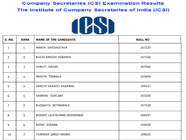 ICSI CS Foundation Result 2019: आईसीएसआई सीएस फाउंडेशन रिजल्ट 2019 आज घोषित किये गए। आईसीएसआई सीएस दिसंबर परीक्षा देने वाले उम्मीदवार ICSI की आधिकारिक वेबसाइट icsi.edu से अपने परिणाम देख सकते हैं। आईसीएसआई सीएस फाउंडेशन 2019 परीक्षा में पांच शीर्ष रैंक पर लड़कियों ने बाजी मारी है। आईसीएसआई सीएस फाउंडेशन 2019 में मान्या श्रीवास्तव रैंक 1 हासिल कर टॉपर बन गई हैं। जबकि दूसरे नंबर पर रुचि राकेश अग्रवाल और तीसरे पर श्रुति नागर हैं। जबकि मरीया तिनवाला ने चौथा स्थान हासिल किया है और सांची संजीव अग्रवाल को पांचवीं रैंक मिली है।