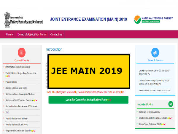 JEE Main 2019 Correction: अगर आप ज्वाइंट एंट्रेंस एग्जामिनेशन (JEE) 2019 में शामिल होने जा रहे है तो ये खबर आपके लिए है। दरअसल जेईई मैन 2019 (JEE Main 2019) के लिए करेक्शन की प्रक्रिया शुरू कर दी गई है। अगर आपने जेईई मैन 2019 (JEE Main 2019) का फॉर्म भरते समय कोई गलती की है तो आप अधिकारिक वेबसाइट jeemain.nic.in पर जाकर आप अपने आवेदन में सुधार कर सकते है। अगर आपके आवेदन में कोई एरर है तो 14 अक्टूबर तक अधिकारिक वेबसाइट jeemain.nic.in पर जाकर उसे ठीक किया जा सकता है। आपको बता दें कि इससे पहले जेईई मैन की परीक्षा सीबीएसई द्वारा आयोजित की जाती थी लेकिन इस साल से ये परीक्षा नेशनल टेस्टिंग एजेंसी, एनटीए द्वारा आयोजित की जा रही है।
